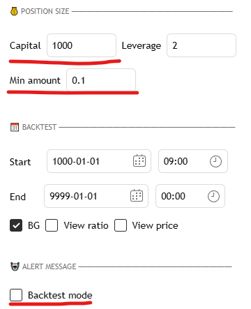 Make sure to input a value that is smaller than your total exchange balance. Then, disable Backtest Mode. At this point, the backtest results will change. The profit rate will likely decrease because, unlike backtesting—where all funds are continuously reinvested with compound interest—live trading will use only the amount specified in Capital, following a simple interest model.