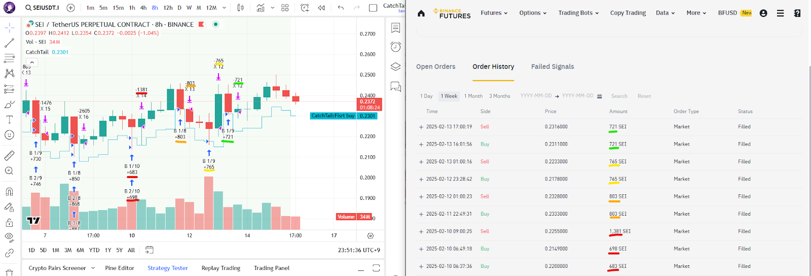 This shows the details of the signal trading currently being tested for SEI.