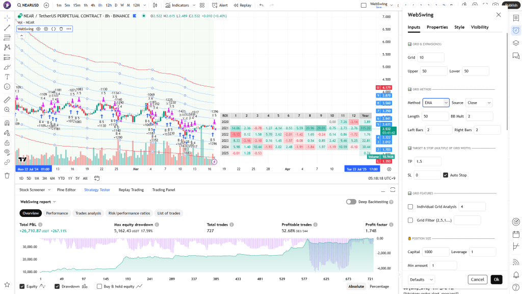 WebSwing is a grid strategy for crypto assets. It enables automated trading on Binance through signal trading via TradingView webhooks. You are invited to use this strategy for $99 per month. Only paid TradingView users with webhook access (Essential plan or higher) can utilize it.