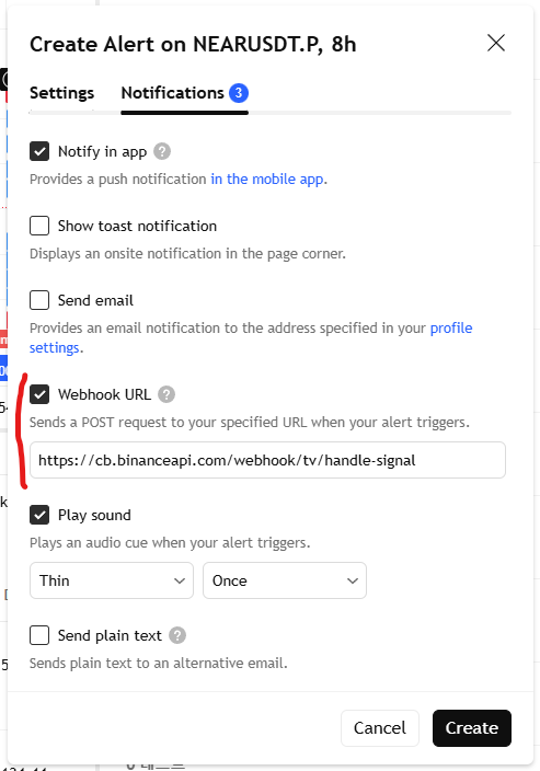 Webhook URL : Check this box and paste the URL you copied from Binance here.